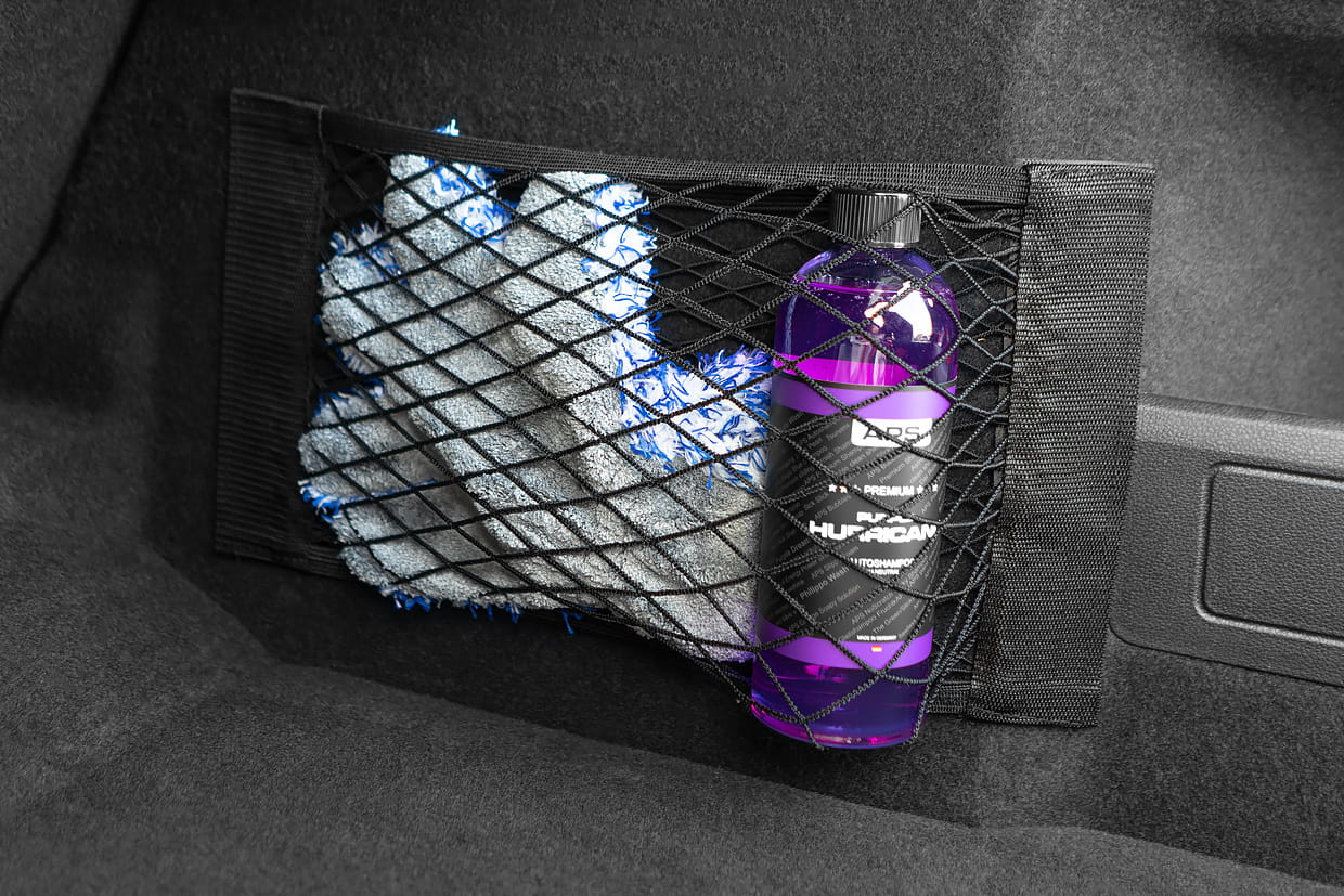 Uniwersalna siatka na rzep do mocowania w bagażniku.