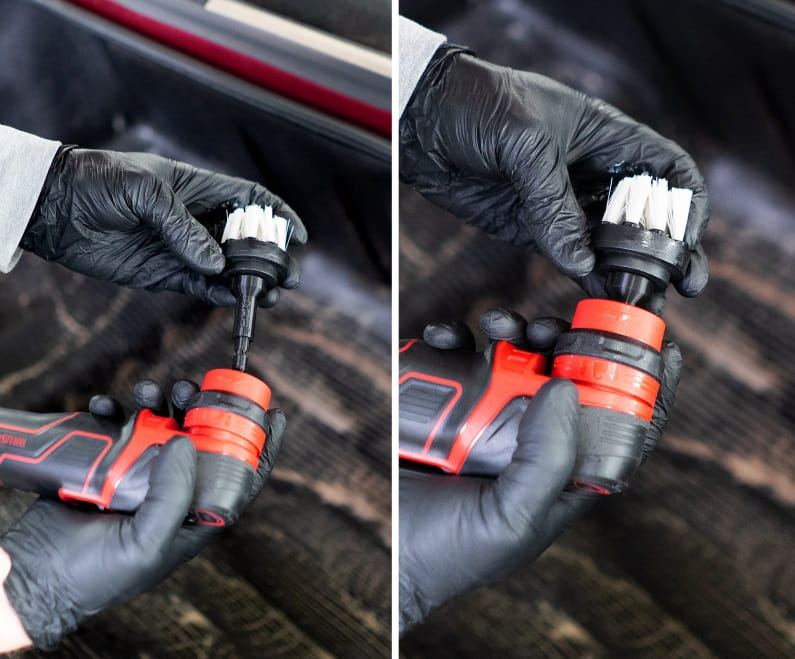 To nowatorskie i niezwykle praktyczne podejście do używania rotacyjnej szczotki czyszczącej bezpośrednio na bezprzewodowej polerce Flex PXE80. Obejmuje to również czyszczenie strukturalnych i mocno zabrudzonych powierzchni z tworzyw sztucznych, pasków gumowych i boków opon, a także plam na tekstyliach, tapicerce i dywanikach.